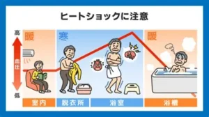 ヒートショックは寒いところ⇔暑いところの切り替わり、寒暖差のあるところで起こるものとされています。