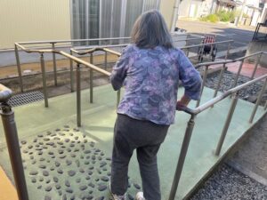 夕凪グループには屋外の歩行練習場があり、段差や色々な種類の地面(舗装、砂、砂利、人工芝)を練習する事が出来ます。