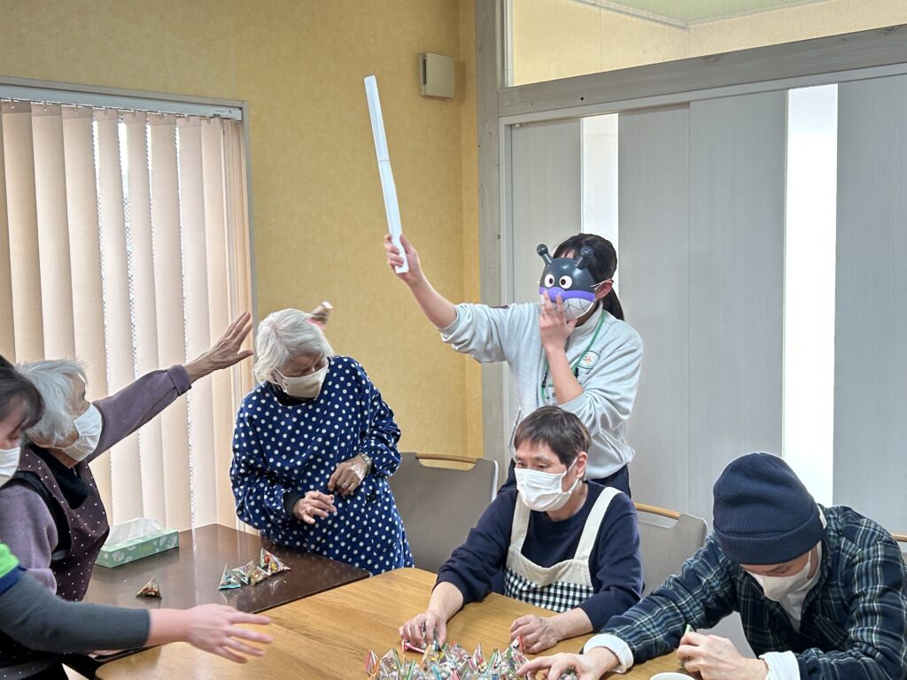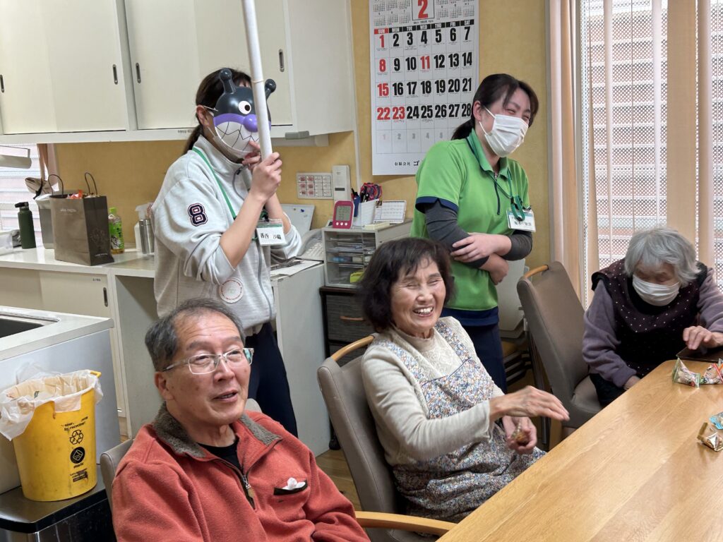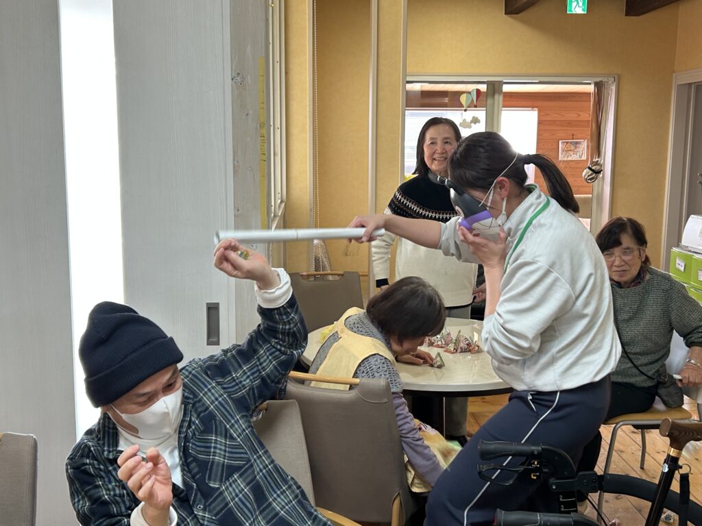 豆をぶつけるだけだ、こんなにもご利用者が童心に戻ることに驚き!(笑)