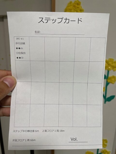 新しい取り組みとしてステップカードを作りました。何を書くのかというと、一日に行った機能訓練の内容を記録していきます👍
