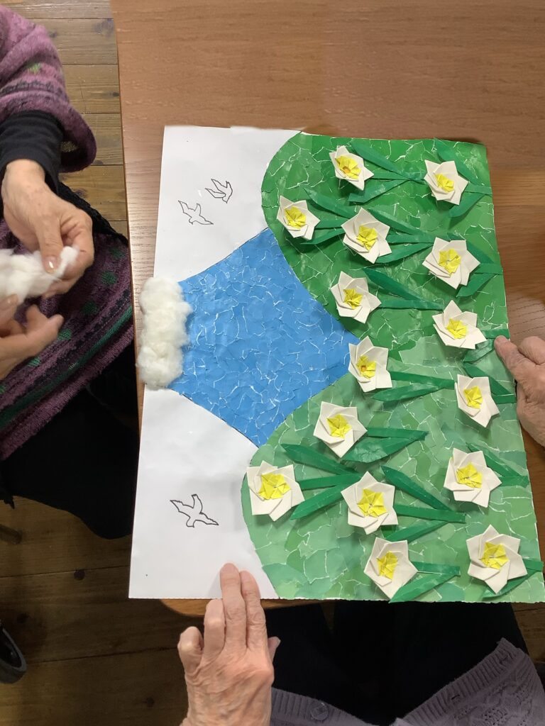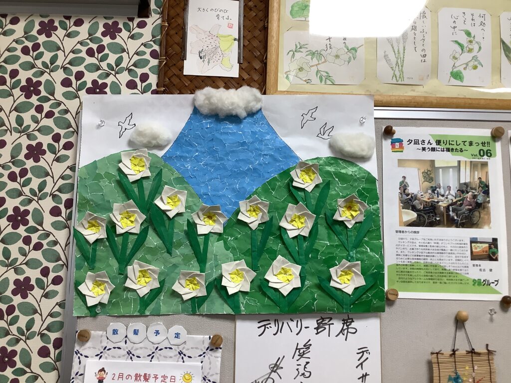今回、季節を感じていただけるよう、フロア内の飾り付けを行いました。今回は冬から春にかけて咲く水仙の花をテーマに、ご利用者様と一緒に制作を行いました。制作では、色紙を使って花びらを折ったり、貼り紙をしたりする作業を行いました。ご利用者様同士で「この色がきれいですね」「昔はよく折り紙をしました」などと会話を楽しまれながら、和やかな雰囲気の中で取り組まれていました。